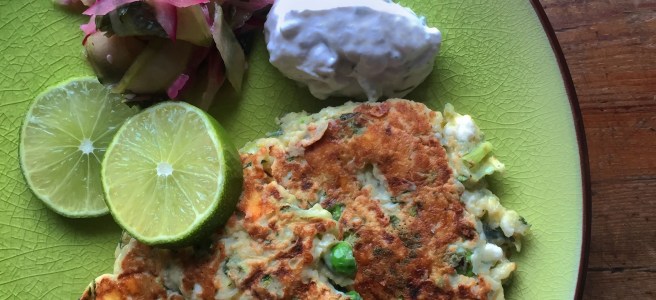 6. Discard the cucumber pickle liquid, shake off any excess and serve with the warm fritters, a dollop of zatziki and a couple of lime wedges.