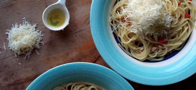 4. Once the pasta is cooked, drain the pasta and add to the pan containing the garlic and chilli oil. Give it a good toss until the spaghetti is well coated. Divide between bowls and finish topped with a generous serving of grated parmesan and a good crack of black pepper.
