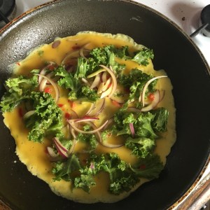 1. Crack two eggs into a jug and give them a quick beat with a fork. Season with salt and pepper. Add the chopped onion, chilli, garlic and kale and give it another quick beat to combine. Grate the cheese and put to one side.