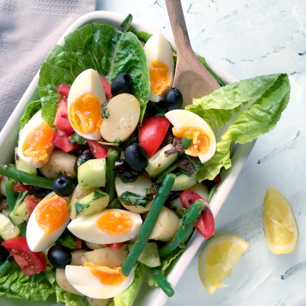 Salad Niçoise originated in the French city of Nice and is traditionally made up of a mixture of Niçoise olives, anchovies, tomatoes and hard boiled eggs. I was surprised to learn that a traditional Niçoise salad doesn’t include tuna, french beans or even potatoes but I guess every recipes it subject to interpretation. However, I’ve included french beans and potatoes in mine because it’s just not a Niçoise salad without them in my opinion. I’ve also substituted the anchovies for a tangy black olive and lemon dressing to give it the salty zing without the fish. Bon appétit.