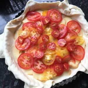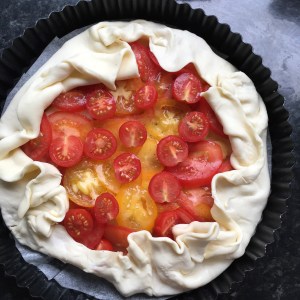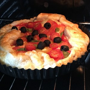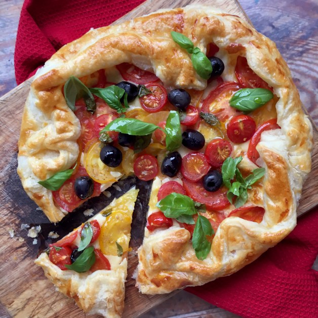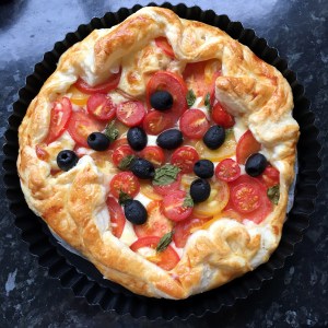 2. Slice the tomatoes (halve the cherry tomatoes) and slice the cheese. Roll out your puff pastry and roughly stretch it over your tart case (you don’t need to be very neat about this, this tart isn’t supposed to look perfect). Layer the bottom of the tart with the mozzarella, leaving a good inch around it for the crust. Top evenly with the tomatoes and season well with salt and pepper. Pull the edges of the tart in on itself, creating a kind of crust. Top with a handful of black olives and scattering of fresh basil leaves.