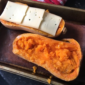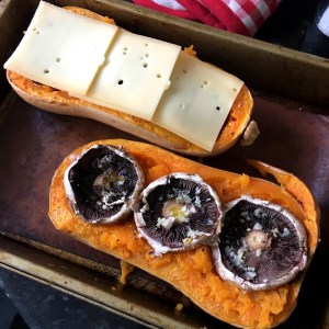 4. Immerse 3 appropriately sized mushrooms into the soft flesh of each squash half. If it all feels a bit full, remove some of the flesh (I ate a couple of spoonfuls of mine). Crush the other two garlic cloves and distribute evenly across all 6 mushrooms. Spread the garlic over each mushrooms, season well with salt and pepper and drizzle a teaspoon of extra virgin olive oil across each squash. Top each squash with three slices of cheese before baking in the oven for a further 15 minutes.