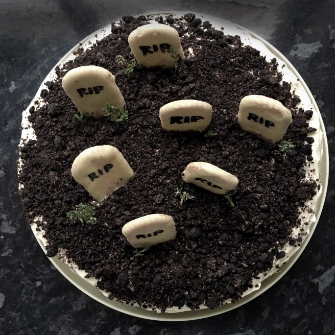 11. Pull each biscuit away from the foil (there’ll be a small chocolate indent on the back of each biscuit but as it’s at the back no one will notice). One by one, pipe on the words RIP onto the front of each biscuit using your icing pen or your pain brush, dipped in a pool of your icing pen. On a chopping board remove the quarter of the biscuit without the chocolate on using a sharp knife and then submerge your gravestone into the cake. Repeat until you have the desired number of graves.