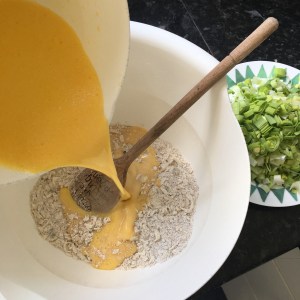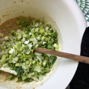 3. Pour the wet ingredients into the dry and stir with a wooden spoon until roughly combined, being careful not to over-mix. Add the diced leeks and stir until evenly distributed.
