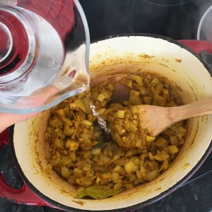 2. Once the onions are soft, add the cardamon, cumin, coriander, chilli flakes, salt, turmeric and mango chutney. Add a dash of water, give it a good stir and cook for a further 5 mins.