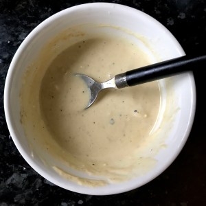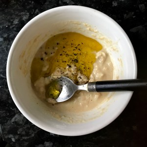3. To make the dressing, whisk all of the ingredients together in a small bowl until you have a smooth and silky dressing before passing it through a sieve to get rid of the raw garlic pulp (sieving the dressing is optional). Rinse and drain the chickpeas and put both to one side.