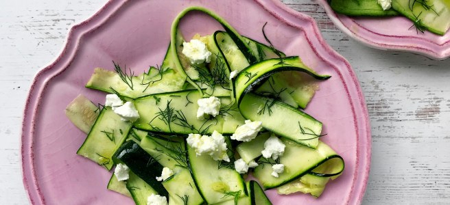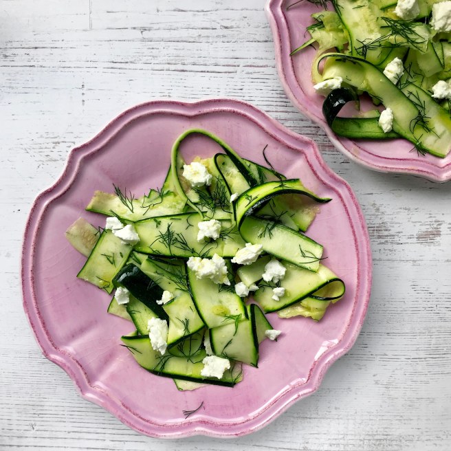 2. Add the chopped dill and give it a good mix (being careful not to break up the courgette ribbons). Once everything is nicely dressed, pour out onto a large platter and dot with chunks of goats cheese. Drizzle with more extra virgin olive oil and serve.