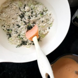 3. In a large mixing bowl, measure out the flours, baking powder, salt and mix until combined. Add the leeks, thyme leaves, cheddar and most of the Parmesan saving a handful for the topping later. Mix well until the ingredients are evenly distributed.
