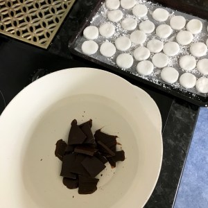 8. Leave in a cool dry place for the chocolate to set. Once set, carefully peel the peppermint creams off the baking paper before boxing up and gifting to a lucky family member or friend.