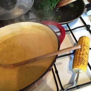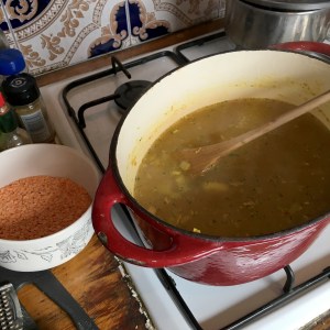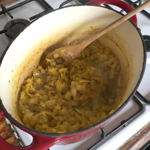 4. After 20 mins the dhal should be thick and glossy. Take off the heat and stir in the cavolo nero and cover with a lid for 4-5 mins.
