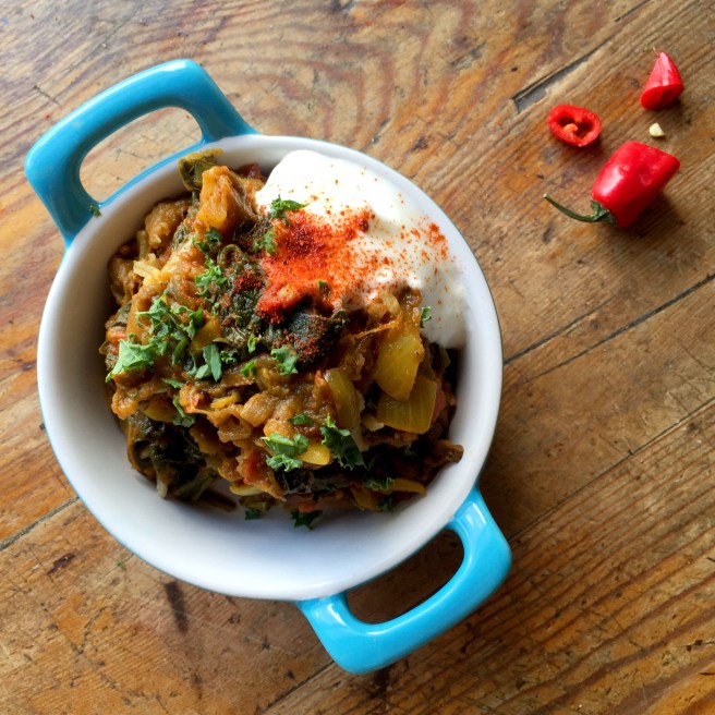 4. Put the onion mix back over a medium heat along with a tbs of water and warm through. Add the aubergine flesh and give it a stir. Add the can of chopped tomatoes and bring to the boil. Once boiling reduce the heat and start adding the spinach a couple of handfuls at a time. Allow the spinach to wilt down into the curry before adding a couple more handfuls, stirring continually. After the spinach has been added reduced the heat and cook for a further 20-30 minutes, stirring frequently.