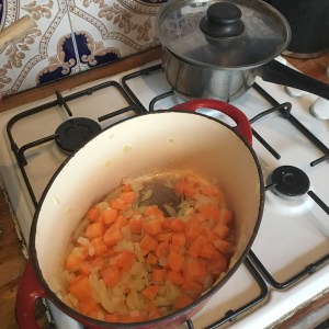 1. In a large cooking pot with a lid, sweat the chopped onions in the oil, over a medium/low heat for 10 mins with the lid on, stirring occasionally – add a dash of water if needed, to prevent burning.