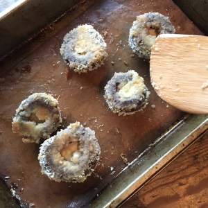 3. Meanwhile, beat the eggs in a bowl with a fork and pour out a generous amount of pako breadcrumbs onto a large plate. Spray a large oven tray with oil and pull the storks out of the mushrooms. Take each mushroom and dip it in the beaten egg. Once covered, roll it in the pako breadcrumbs until well coated and place on the oiled baking tray. Repeat this process until all your mushrooms are covered. Spray with oil and put in the oven for 20 minutes, turning halfway through.