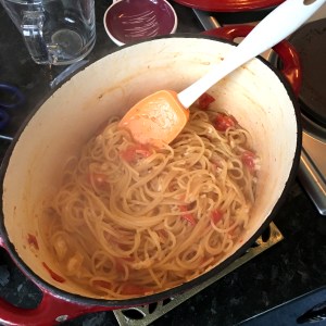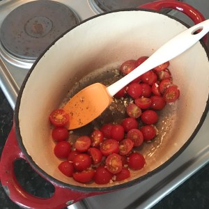 2. In a large pan with a lid, add a tablespoon of oil and put on a medium heat. Add two finely chopped garlic cloves, cherry tomatoes, ½ tsp salt flakes and ¼ tsp black pepper. Cook for 2 mins stirring continually. Pour over 500ml of boiling water, add the spaghetti and put the lid on (make sure your pasta is fully submerged in the water before putting the lid on). Up the heat and bring to the boil.