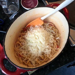 4. Once the pasta is cooked, take off the heat and allow to cool for a minute before adding most of the grated cheese (keep a little back to sprinkle on top of each portion). Mix vigorously (this prevents the cheese coagulating) until the cheese has melted.