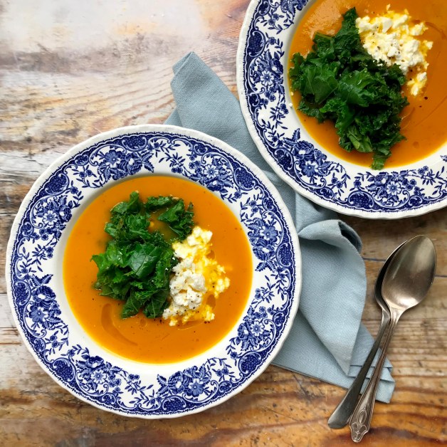 5. Finally blitz well in a food processor or with a hand blender until smooth and creamy in texture. If serving topped with kale and feta, cover the soup to keep it warm and steam or boil the kale for a few minutes before diving the soup into bowls and topping with the kale and crumbled feta.