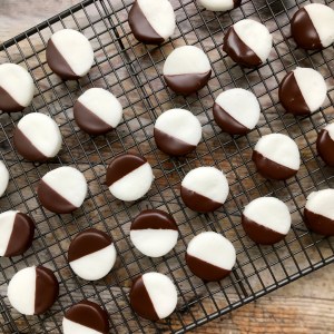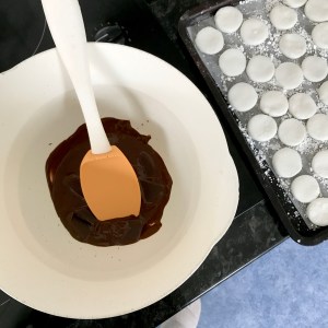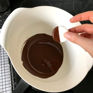 7. Once melted, tilt the bowl slightly to the side to allow a deeper pool of chocolate for you to dip your peppermint creams into. One by one, dip each peppermint cream into the chocolate, wait for the drips to stop and place on your newly lined cooling rack. Repeat until all of your peppermint creams are coated.