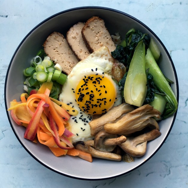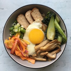Anyway, back to bibimbap. I’ve been a bit obsessed with Korean food ever since Kimchee opened near my old office on New Oxford Street. Relatively new to Korean food, I was astonished at the vegetarian selection; delicious tofu salads, sushi rolls, steamed rice bowls with marinated tofu and pickled vegetables, err – yum! But then I moved away so had to take matters into my own hands. My favourite Korean dish is bibimbap, a mixed rice dish served with gochujang (a type of red chilli paste) with a mixture of steamed and pickled vegetables and topped with a fried egg. It’s delicious, so if you’re feeling frisky, give it a go.